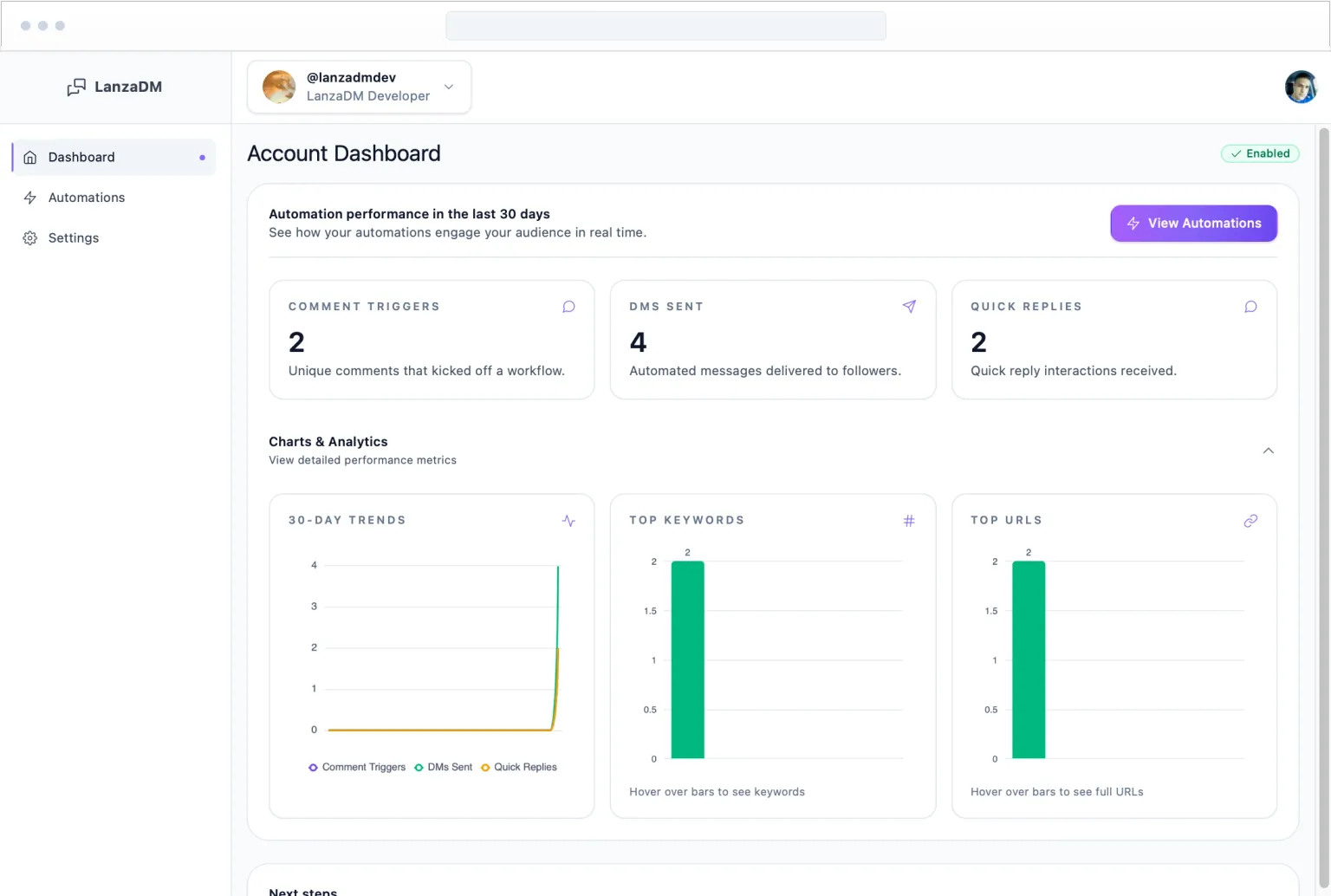 LanzaDM watches for new comments on your Instagram posts and automatically sends a personalized DM when people comment with your chosen keywords.