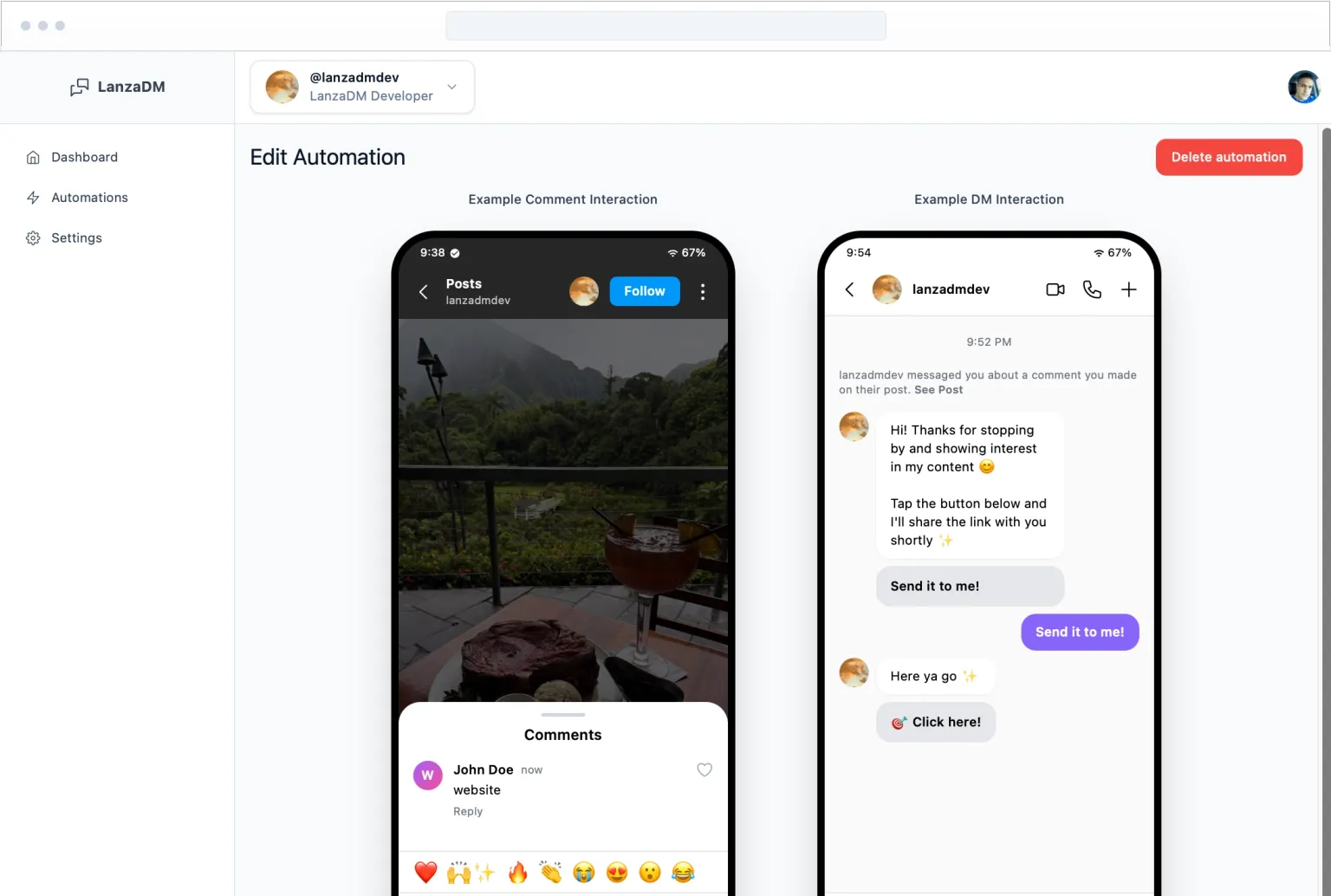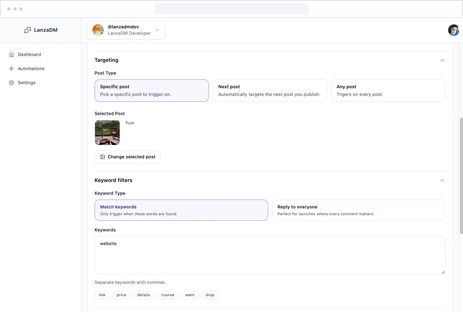 I used to promise "comment LINK and I'll DM you the link" and then spend hours replying. With LanzaDM, every comment now turns into an on-brand DM automatically.